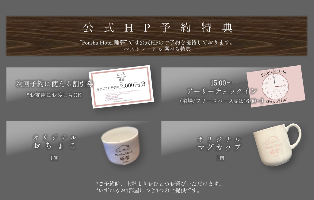 ご滞在中にフリーでお楽しみいただける日本酒を20種類以上揃えてみました。肩ひじ張らず、時間を忘れて地酒やクラフト酒を楽しめる。酒好きな人たちが、もっと気軽にお酒を楽しめる。それがPonshu Hotel 睡夢です。