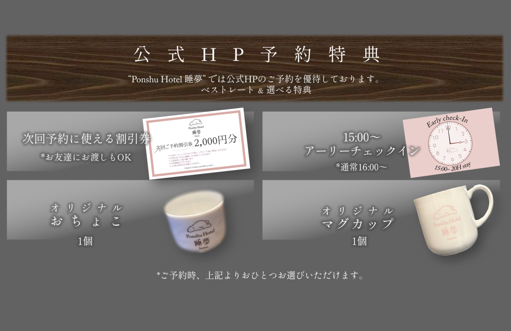 ご滞在中にフリーでお楽しみいただける日本酒を20種類以上揃えてみました。肩ひじ張らず、時間を忘れて地酒やクラフト酒を楽しめる。酒好きな人たちが、もっと気軽にお酒を楽しめる。それがPonshu Hotel 睡夢です。